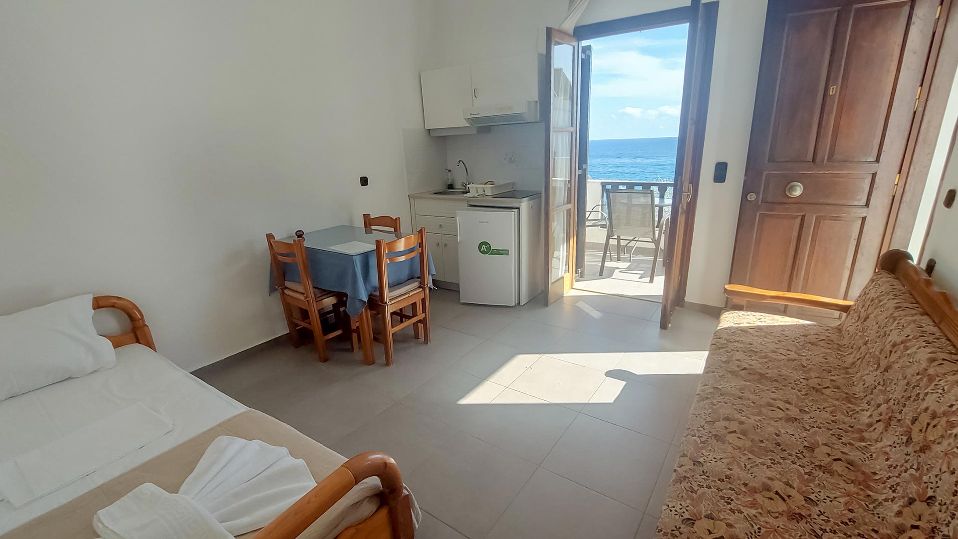 Apartment No. 1 is a spacious ground floor unit that offers a comfortable and relaxing stay by the sea. The apartment features a bedroom with a double bed, providing a cozy sanctuary for a restful night’s sleep. In the living room, there is an additional single bed, perfect for accommodating an extra guest.